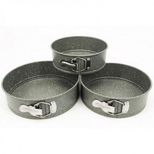Набір форм для торта, круглої форми, складається з трьох форм різного розміру. Зручні та практичні форми виготовлені з високоякісної вуглецевої сталі з міцним, мармуровим, антипригарним покриттям, завдяки чому тепло добре розподіляється по поверхні, а спеціальне покриття є стійким до різних пошкоджень, що забезпечує довговічність форми.