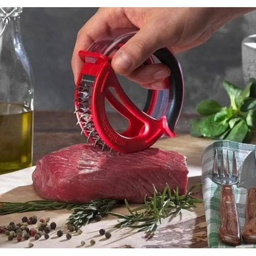 Круглий тендерайзер із технологією голчастих лез дозволяє обробляти м'ясо та рибу без шуму та бризок, скорочує час маринування на 70% та час приготування в духовці чи грилі на 50%.