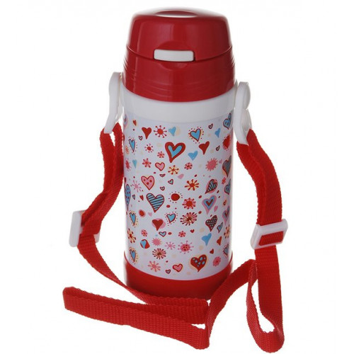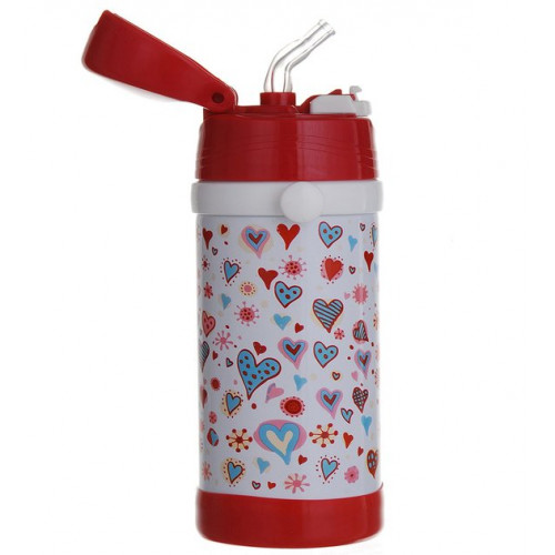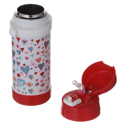 Дитячий вакуумний термос А-PLUS 320 мл з трубочкою і шнурком для носіння на шиї (1776) Червони з сердечками
