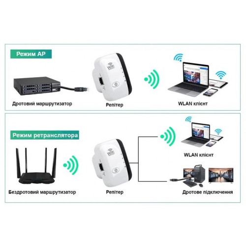Бездротовий репітер дозволяє посилити сигнал Wi-Fi там, де він слабкий. На відкритому просторі посилення до 50 метрів, приміщення до 10 метрів.