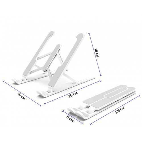 Головна функція універсальної підставки – це зручне розміщення ноутбука на рівні очей та безперешкодна подача повітря для охолодження. Завдяки високому положенню ноутбука на підставці вентилятор не втягує пил, збільшуючи термін експлуатації пристрою. Дуже просто встановлюється і складається в компактний розмір, що дозволяє носити з собою в офіс або заняття.