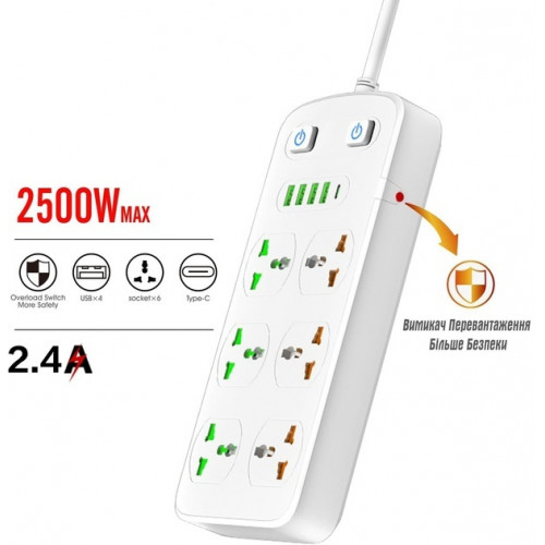 Він оснащений міцним подовжувачем довжиною 2м та двома вимикачами на кожні три розетки для захисту від перевантаження.